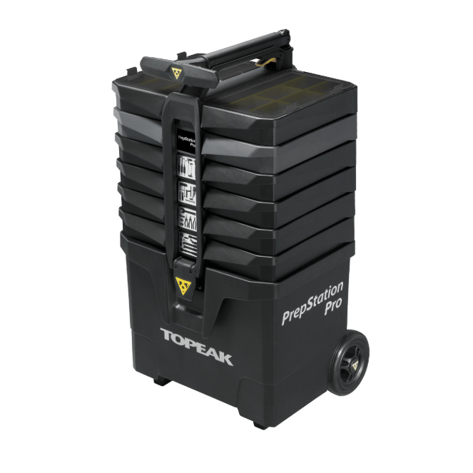 Enostavna premikajoča postaja za orodje na vozičku s 5-palčnimi kolesi in sedmimi predelki za orodje, ki vsebuje 55 profesionalnih kolesarskih orodij (85 funkcij). Kolesno podlago je mogoče preprosto izvleči, da podaljšate delovno podlago za večjo stabilnost. Dvižni ročaj s pritiskom na gumb odpre predale za orodje za hitra in enostavna popravila.
