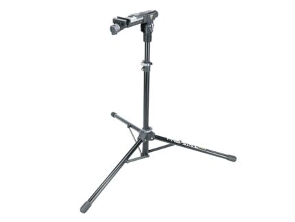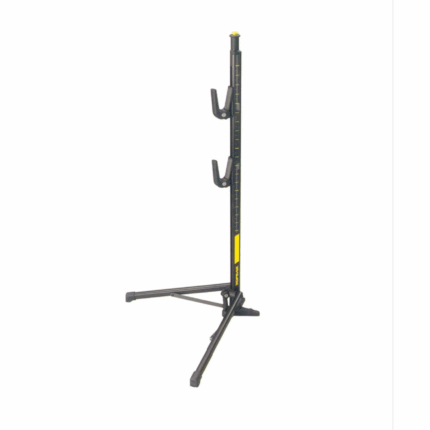 Lahko in zložljivo stojalo za shranjevanje koles. Vzmetni nosilec stabilizira prednje ali zadnje kolo in sprejema kolesa premera od 20″ do 29″.