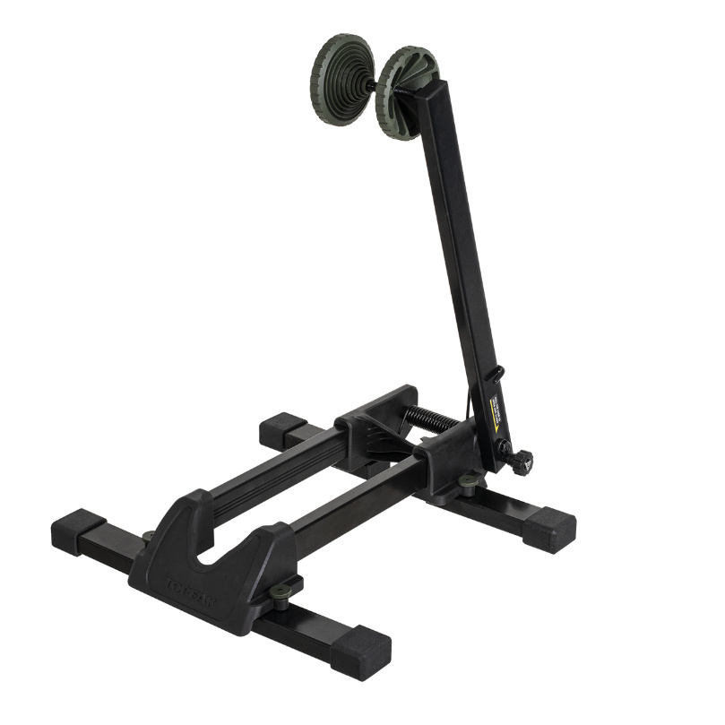 Trpežno, zložljivo stojalo za shranjevanje in razstavljanje koles. Vzmetna roka stabilizira zadnje kolo, nastavljiv kolesni valj pa sprejme 20 mm cestne pnevmatike do 3,25″ široke pnevmatike za gorska kolesa. Primerno za večino cestnih koles, gorskih koles ali električnih koles.