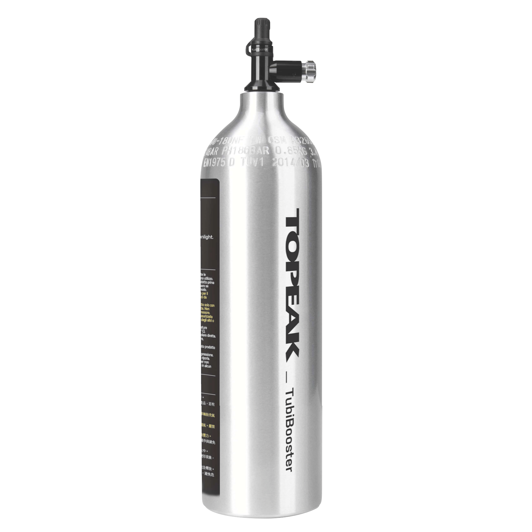 - Aluminijasta glava TubiBooster deluje tudi kot napihovalnik CO2 in je združljiva s kartušami Topeak z navojem 16 g/25 g CO2.